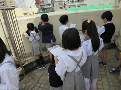 「わたしたちのまち」の様子を屋上から確認しました。方位磁針を使って東西南北を確認し、どんな建物があるのかメモをとりました。次の時間にメモを持ち寄って、クラス全体で、学校から見た建物をまとめます。