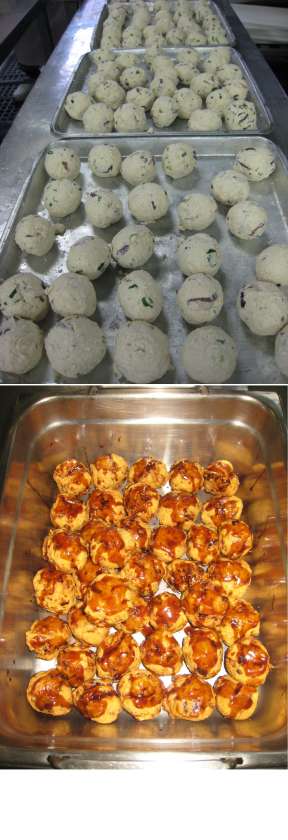 「たこボール」は大阪ご当地〔粉もん〕の王者級のひとつである「たこ焼き」を、学校給食で実現できないかと考えられた献立です。平成20年に初登場し、今年で10年目になります。とうふ、じゃがいもでんぷん、小麦粉、かつおぶし、青ねぎ、塩で作った生地にたこを加え球形にし(写真2枚目)、油であげ、トンカツソース、ウスターソース、砂糖で作ったソースをかけました。
