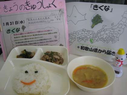 「きくなとはくさいのおひたし」は、砂糖、しょうゆで味付けした彩がよくきくなの香りのあるものでした。きくなを学校給食で初使用したのは、平成19年1月で今年で11年目になり、12月と1月に使用しています。
