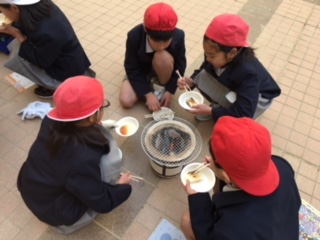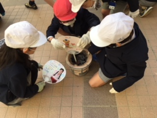 社会科で、道具とくらしのうつりかわりについて学習しています。七輪体験で、火おこしにチャレンジしました。炭に火をつけることに苦労していましたが、上手にお餅を焼いておいしくいただきました。3年2組は来週の火曜日に行います。楽しみです。