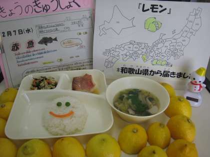 *レモン:給食では平成7年2月〜より安全性の高い国産のものを使用し始めました。それ以前はアメリカ産を使用(年中使用可)していましたが、国産品となり旬の1〜2月のみ味わっています。(本日は和歌山産)