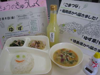 中国揚子江上流の原産で、日本へは奈良〜飛鳥時代に伝わってきたとされています。多量の酸を含むので生食には適さず、その強い酸味と香りを生かして酸味料・香味料として日本料理に利用されています。ゆずの香りには、精神をリラックスさせる効果があります。給食でのゆず果汁の初登場は平成15年3月で、16年目になり、ゆずの特産地として有名な徳島県木頭地区のものを使用しています。