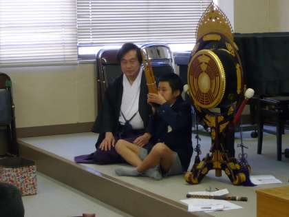 高津神社の小谷宮司さんと高津神社で演奏されている山下さんが来られ、雅楽で使われる「吹きもの」と呼ばれる管楽器(笙・竜笛・篳篥)の紹介と音色を聴きました。