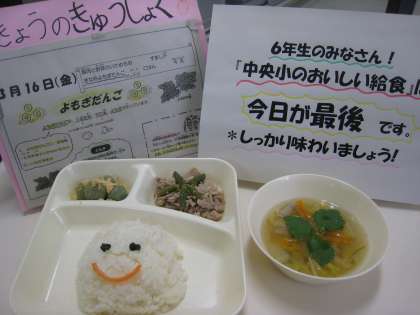 春の訪れを感じさせてくれる『よもぎだんご』にニコニコ笑顔でした!(3/16の給食)
