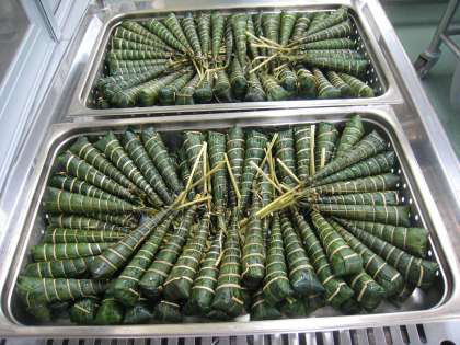 「ちまき」をこどもの日の行事献立に使用し始めたのは、1986年からで今年で33回目の登場です。今日は972個蒸しました。