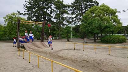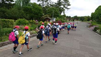服部緑地に行きました。班の友達と協力して、ポイントを回り、クイズやゲームを楽しんでオリエンテーリングをすることができました。また、公園では遊具で元気よく遊び、お弁当は、円形花壇が見渡せる場所で、みんなでそろっておいしくいただきました。
