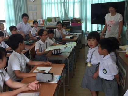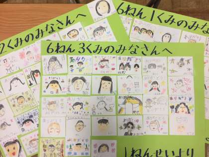 1年生のみんなで作ったお礼のカードを、代表の児童が6年生の教室に届けに行きました。ドキドキしながら話すと、6年生はニコニコと受け入れてくれました。