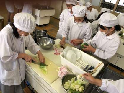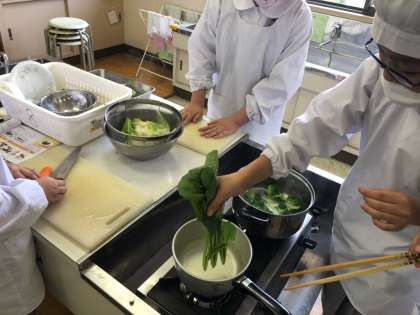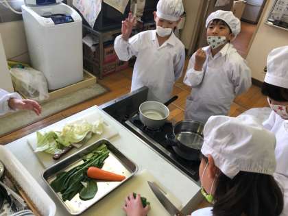 本日、5年3組と4組が調理実習をしました。昨日と同じく、みなで協力し、安全に実習を行うことができました。