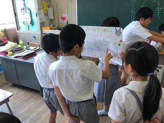 今日は、27日にあるふれあい集会に向けてお店の準備や、店番のリハーサルをしました。お客さんになったときの注意や、お店を回る順番を確認したあと、リハーサルをしました。どの班も、自分たちの役割を一生懸命練習していました。27日のふれあい集会が楽しみです。