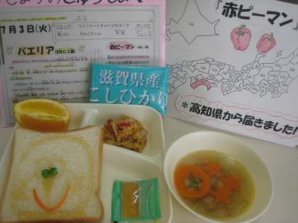 パエリアはスペインのバレンシア地方(おいしいお米の産地)の代表的な料理です。米と肉、魚、野菜等と一緒に炊き込んだもので、世界的に人気があります。【パエジャーラ】という専用の浅い鍋で作る所からパエリアという名前が付きました。今日は、米(滋賀県産コシヒカリ)、鶏肉、いか、たまねぎ,赤ピーマン、トマト、三度豆、にんにくで作りました。パエリアが給食に初登場したのが平成24年7月で、2年に1回の登場なので今年で4回目となります。