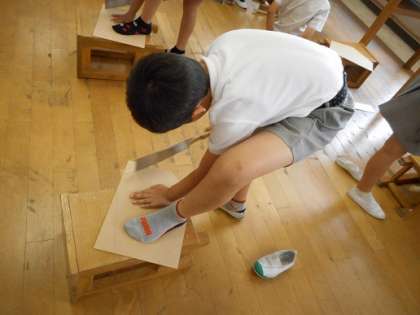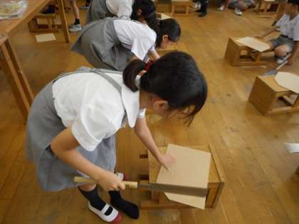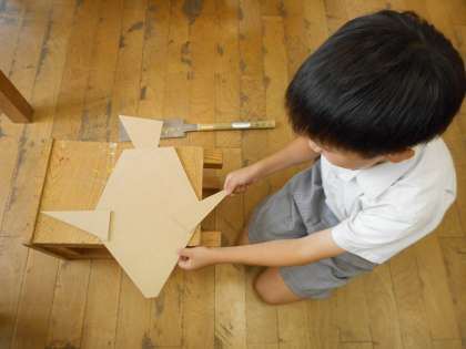 4年生は、初めてのノコギリを使って、木工作品に挑戦中です。