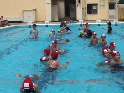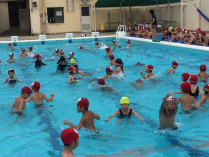 1年生は、今日が1学期最後の水泳学習でした。天候の都合で、なかなか入れる日がなかったのですが、入水するときの決まりや合図などを守れるようになりました。また、顔をつけたりもぐったりして水に慣れることもできました。
