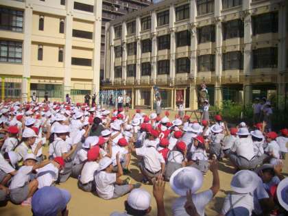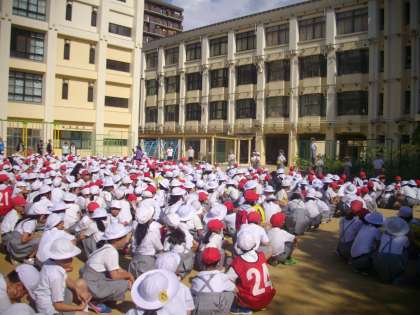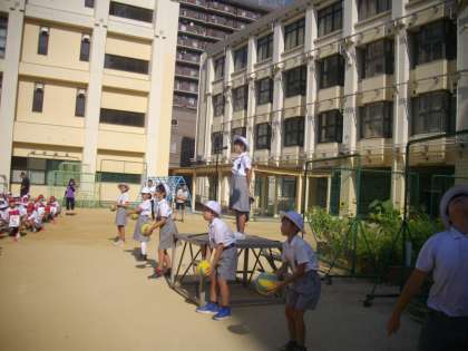 2学期最初の児童集会は、何個ボールが投げ上げられたか、数えるゲームをしました。