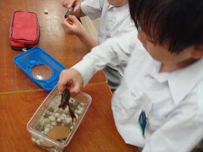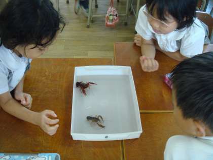 何人か、ザリガニの体を後ろから捕まえるのに成功する
