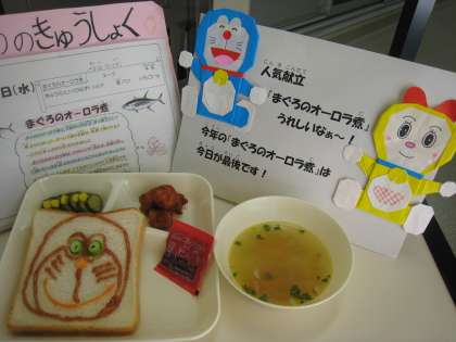 「まぐろのオーロラ煮」のオーロラソースの味が絶妙でとってもおいしく、人気があるのでずっと登場している歴史のある献立です。元々は、大阪市発祥の献立「くじらのオーロラ煮」(「オーロラ煮」の名称は、南極で見られるオーロラの美しさから名付けられました。)でしたが、くじらが使えなくなってから「まぐろのオーロラ煮」となり、「オーロラ煮」はとぎれることなく、60年近く出ている大人気献立です。