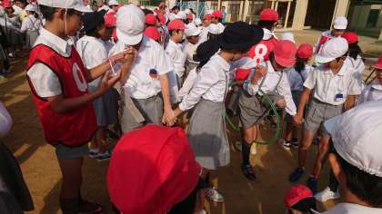 班のメンバーで手をつないで、体を使ってフラフープをくぐっていきます。