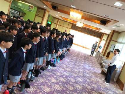 朝のつどいが終わりました。校長先生から出発式での3つの約束の話がありました。児童代表から今日の予定が伝えられました。浜辺散策はせず、朝食をいただきます。