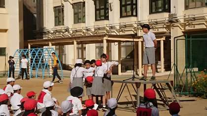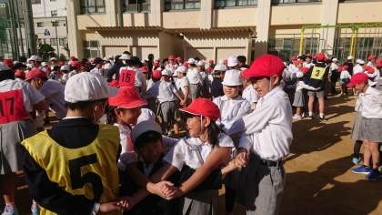 班のみんなで手をつないで輪になって、知恵の輪のようにくぐって、絡まります。