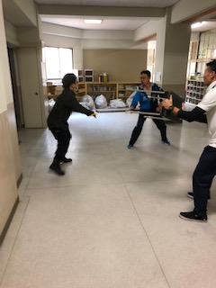 警察の方が不審者役になってくださり、各学年のフロアを回りました。