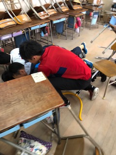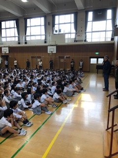 最後に講堂に集まり、区役所の方(青色パトロール)、警察署の方から講話をしていただきました。子どもたちの落ち着いて訓練する姿を見て褒めてもらいました。