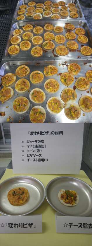 「変わりピザ」は、ツナ、コーン、ピーマン、チーズをピザソースで和え、ギョーザの皮に載せて焼きました。ピザ生地は焼くのに時間がかかり給食として出せなく、なんとかピザが出来ないかと工夫し、ギョーザの皮を使うことで1人1枚が実現しました。「変わりピザ」は今から16年前の平成14年から登場し、人気献立となっています。焼く時間が5分と短いので、お家でもチャレンジされてはいかがでしょう。「変わりピザ」は、チーズ除去食も作り、中央小学校全員で味わいました。