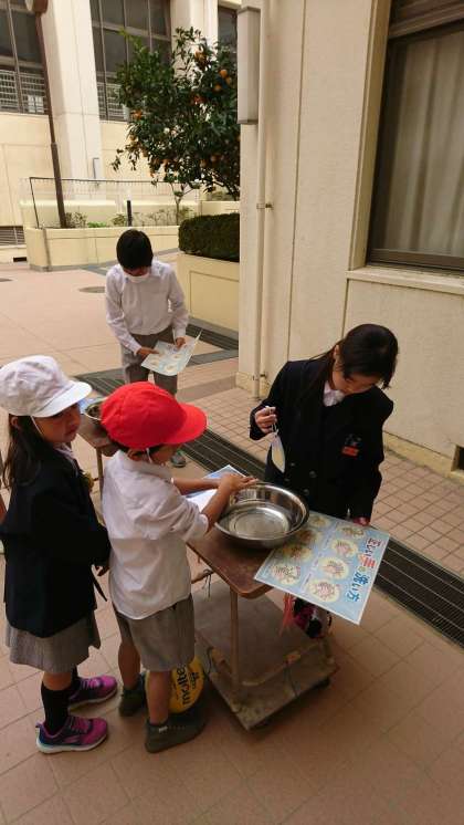 今週は手洗い・うがい週間です。健康委員会の児童が、ピロティ−で正しい手の洗い方を教えてくれます。みんなで声をかけあって、手洗い・うがいをしっかりして、健康な中央小学校を作りましょう。