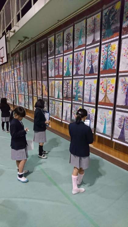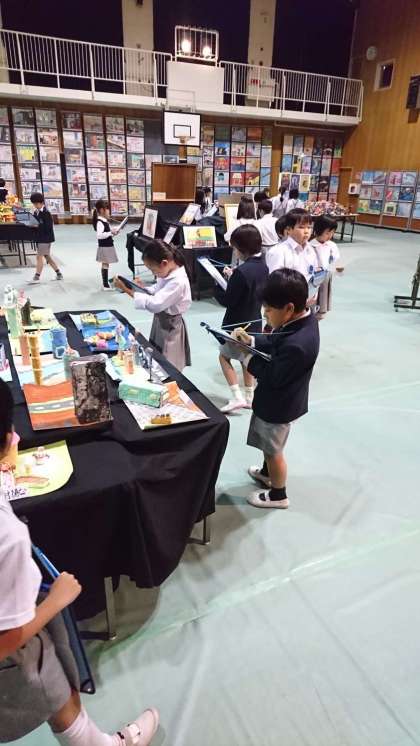 本日より作品展が始まりました。3年生の子どもたちは鑑賞の時間をとても楽しみにしていました。自分の作品の出来栄えに満足する子や友達の作品に感心する子が見られ、有意義な鑑賞の時間となりました。土曜日はお子様の立派な作品をぜひ楽しんでいただきたいと思います。