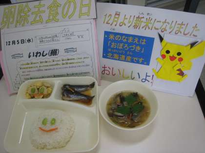 今日のメニューは「いわしのしょうが煮(年1回)、うすくず汁(年1回)、高野どうふの卵とじ(年1回 卵除去食も調理)、ごはん、牛乳」でした。