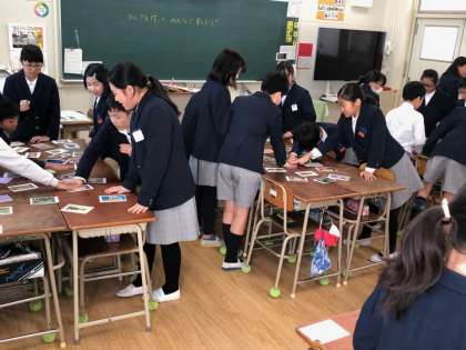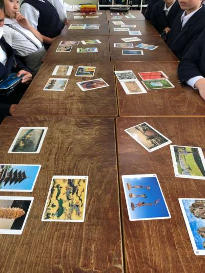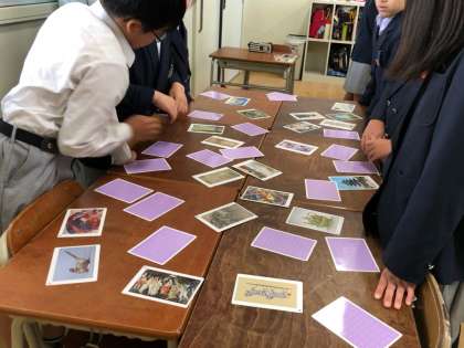 5年生は、アート・カードを使って鑑賞の学習をしました。アート・カードは、世界的に有名な絵画や彫刻、建造物などをカードにしたもので、1セット40枚あります。