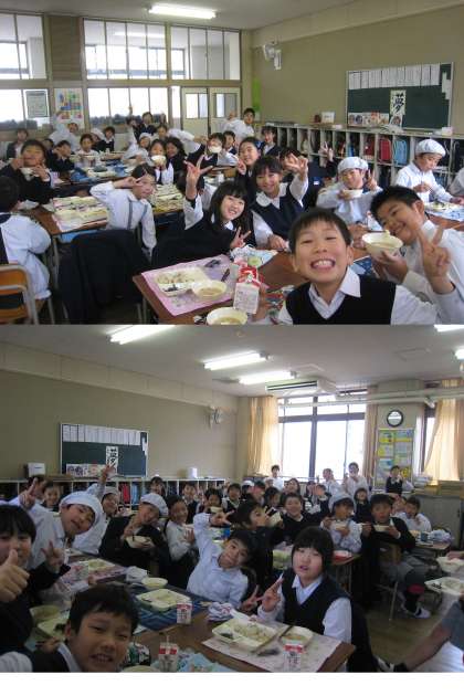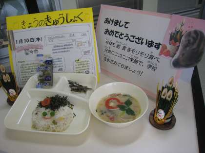 子どもたちは、学校で友達と一緒に食べるお正月の行事献立にニコニコ笑顔でした。