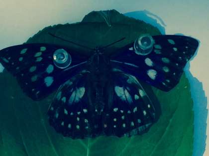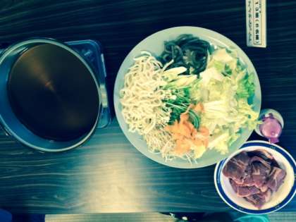 食堂に国蝶オオムラサキの標本がありました。ハチ高原には絶滅危惧種のオオムラサキがいるんですね。夕食は、スキヤキ。