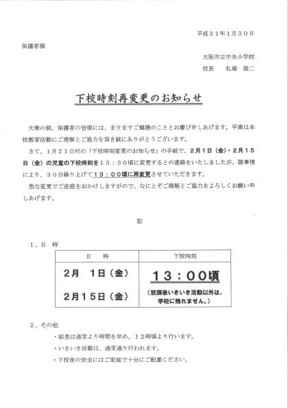 2月1日(金)・2月15日(金)の下校時刻を13:00頃に変更します。