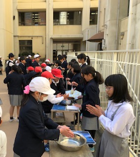 また、健康委員会の児童が昼休みにピロティ−で、模擬手洗いをしています。