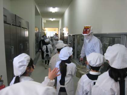 一昨日の節分から2日遅れで、節分の行事献立「いわしのしょうがじょうゆかけ(年1回)、含め煮、いり大豆(国産大豆)、ごはん、牛乳」を鬼さんから手渡していただきました。