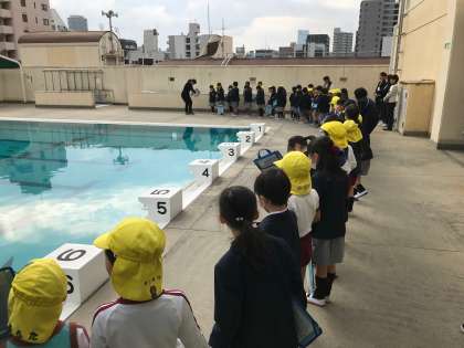 「夏のプールの水は冷たいけど気もちいいで。」とか「ランドセル重たくない?」など、園児に目線を合わせ、やさしく声かけをしていました。