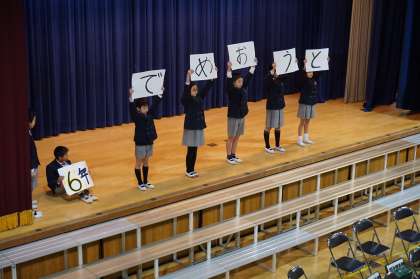 1文字ずつばらばらになった6年生へのなかよし言葉を当て、6年生に伝えるゲームでした。