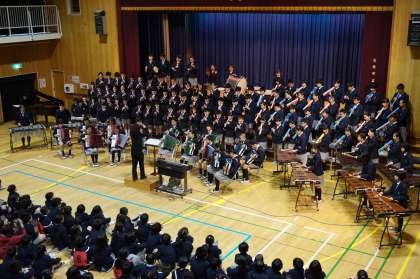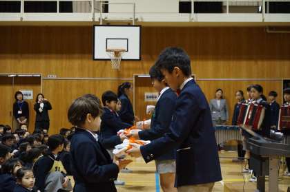 6年生の合奏と、6年生からのプレゼント、校長先生のお話の様子です。