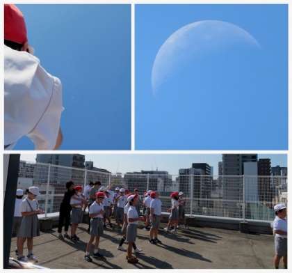 月といえば夜のイメージですが、今日は、青空に月が見えており、屋上で方位と高さ(角度)を調べました。