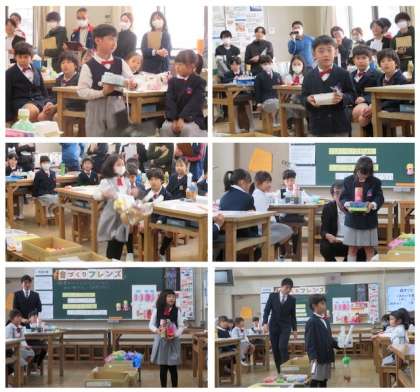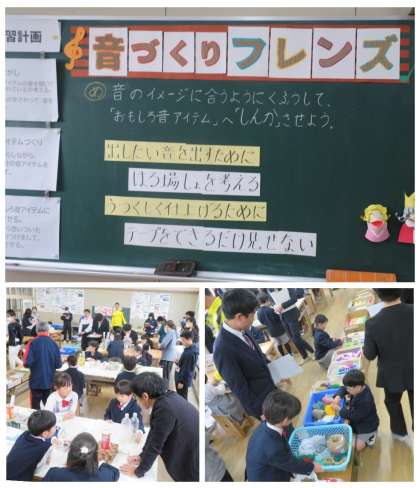 身のまわりの物をたたいたり、振ったり、はじいたりすると音が鳴ります。2年生は、その奏でられた音を「〜みたいな音」とイメージし、様々な材料を組み合わせて、「音アイテム」をつくっていきました。さらに、音に合う形や色を使って飾りつけ、「おもしろ音アイテム」に進化させました。うまくいかなくて困っている人には、同じ班の友だちが優しくアドバイスする姿も見られました。