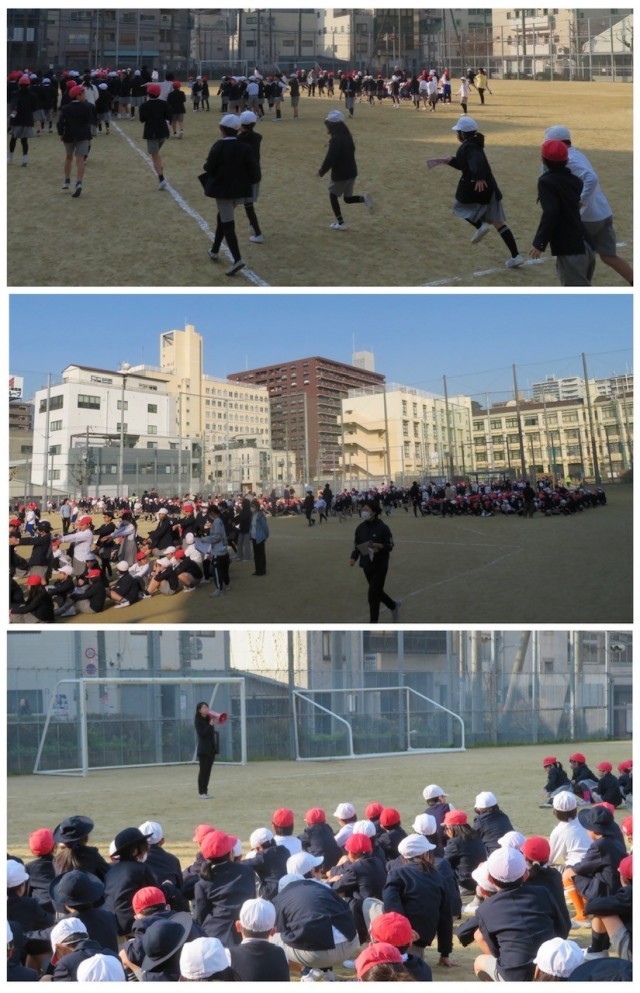 今日は、理科室から出火の想定で避難訓練を行いました。静かに放送を聞き、ハンカチ等で鼻と口をおさえながら瓦屋町グラウンドへ避難。副校長先生から、万が一の備え、命を守る行動がとれるよう避難訓練を実施していることや、1995年の1月17日に起こった阪神・淡路大震災の時にも広い範囲で火災が発生した話を伺いました。