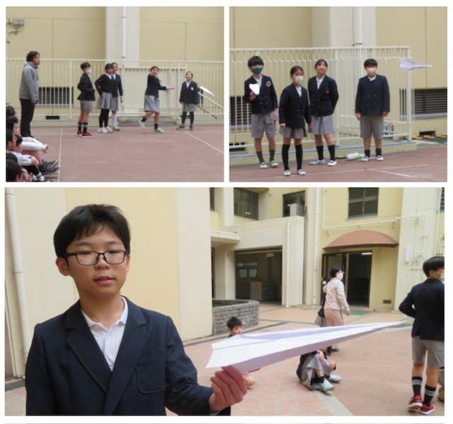 今年度最後のクラブ活動は、「最強紙飛行機選手権」を行いました。B4の用紙を折って、より遠くに飛ぶ飛行機を作りました。