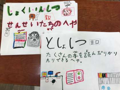1年生を案内するために、学校にあるたくさんの教室を説明するための看板をつくっています。