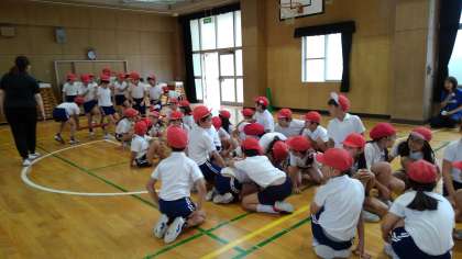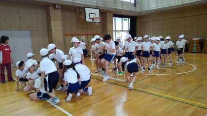 練習の初めは、子どもたちは『どんなの〜?』と不思議そうでしたが、やり方を示すと、もう真剣そのもので白熱した「台風の目」となりました。今や練習を重ね、協力しながらとても素早くできるようになりました。