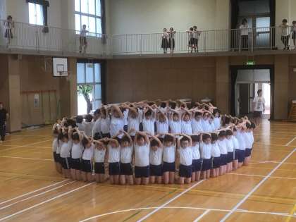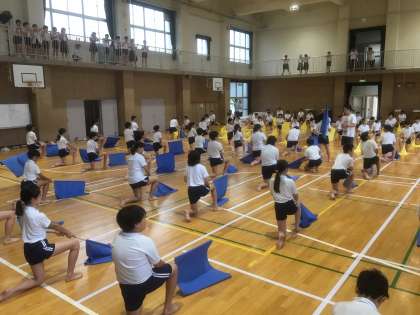 運動会に向けて、6年生が最後の練習を行いました。2階のギャラリーには、4年生も応援に駆けつけ、お兄さん、お姉さんの演技をしっかりと目に焼き付けていました。