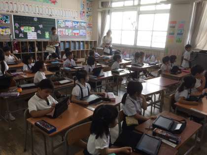 3組は図工、4組は国語の学習をしました。図工ではタブレットを使い、楽しんで取り組みました。国語では、「あひるのあくび」のオリジナルバージョンをそれぞれが一生懸命考えました。