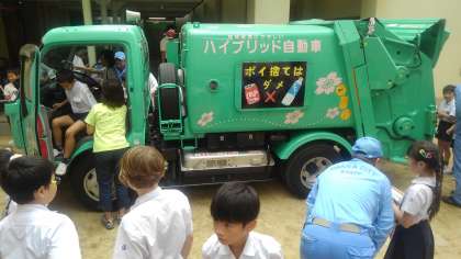 休み時間には、パッカー車の見学もしました。緊急停止ボタンを3つも4つも見つけたり、特別に運転席に乗せてもらったりしました。順番待ちをしている間に、質問をしている子も見られ、意欲の高さがうかがえました。