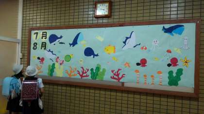 学校にお越しの際には、ぜひ玄関に飾っている「夏らしい」掲示物もご覧ください。蒸し暑く、また梅雨模様も広がりますが、もう少しで夏休みです。涼やかな気持ちになれば幸いです。