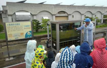また、小雨が降る中、レインコートを着て外の施設を見学しました。広大な「貯水池」の場所に来た時には「ほんまに教科書と同じで原っぱみたい」と、率直な感想を述べていました。