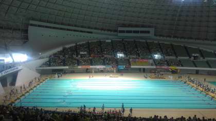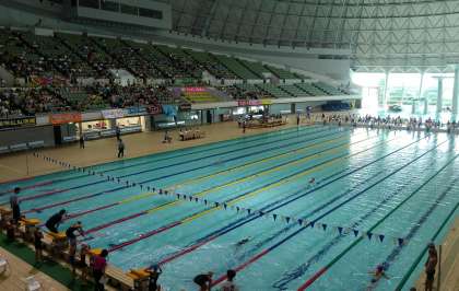 今年の運動会をした中央体育館のような非常に大きなプールなので、同時に10人(10チーム)がスタートできます。会場では、応援幕を広げてエールを送る学校もありました。西船場の「ガンバレ」という水色の幕もはためいていました。