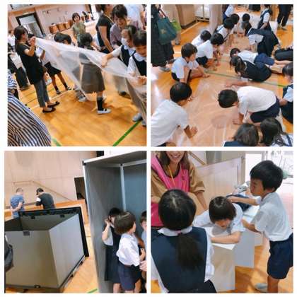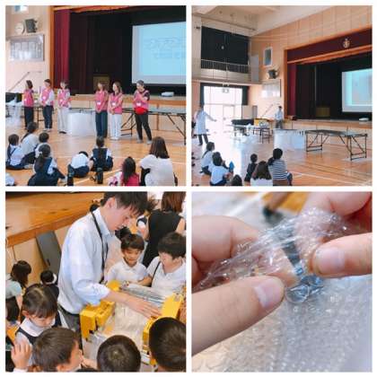 実際に、プチプチを使った防災用具やたくさんの種類のプチプチを触って体験しました。プチプチを潰して音を鳴らしたり、プチプチの上に寝転がったりしてとても楽しんでいました。